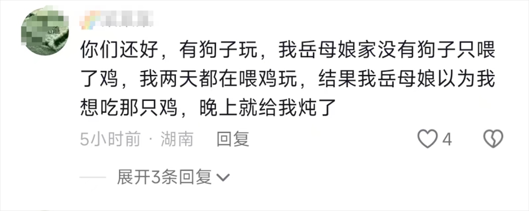 有的網友為了防止丈人家的狗不陪自己玩,干脆自己帶了一只狗去擼,而那些沒有狗玩的女婿就比較落寞了,只能找些小雞小豬聊聊天。