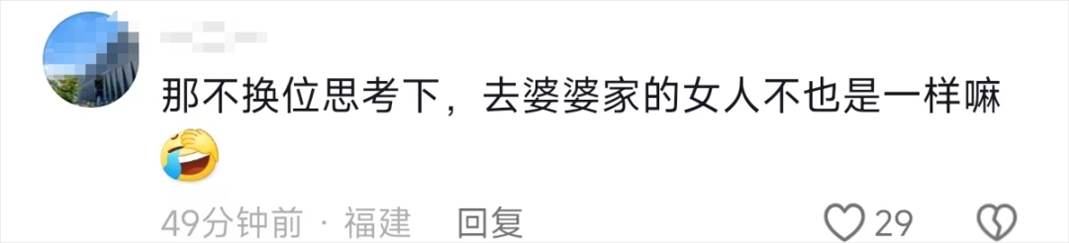 還有網友表示,這個時候,女婿更應該能過體諒媳婦在婆家過年的難處了,大家過年要互相體諒,換位思考。