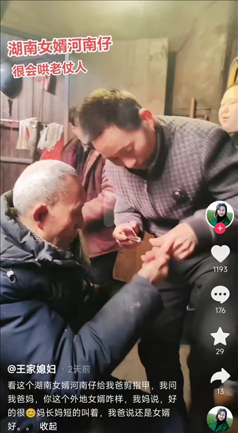還有的女婿“眼里有活”,去了丈母娘家什么都干,修燈泡、放牛、做飯、打麻將,入鄉(xiāng)隨俗無所不能,深受丈母娘好評。