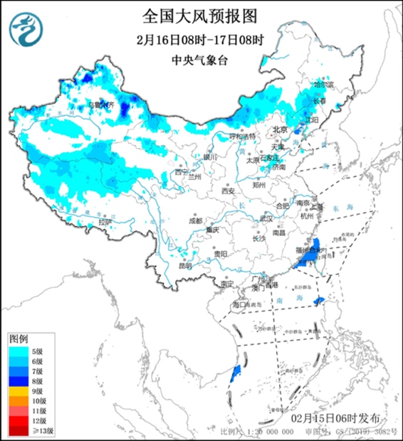 圖1 全國大風(fēng)預(yù)報圖(2月15日08時-16日08時)