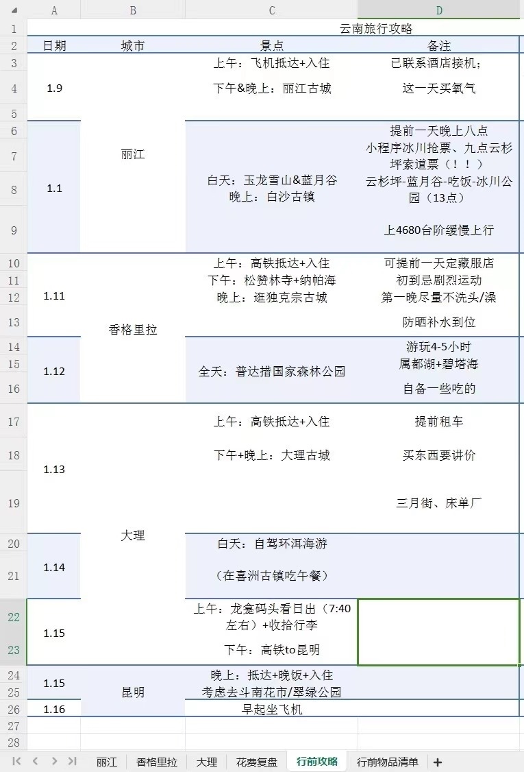這個冬天去云南旅行前,周玫將自己的計劃制成一張excel表格,具體到每個市、每個景點、每種美食……旅行結(jié)束后,她還對云南游的具體執(zhí)行情況進行了復(fù)盤總結(jié),在社交平臺上分享給她的“電子驢友”。