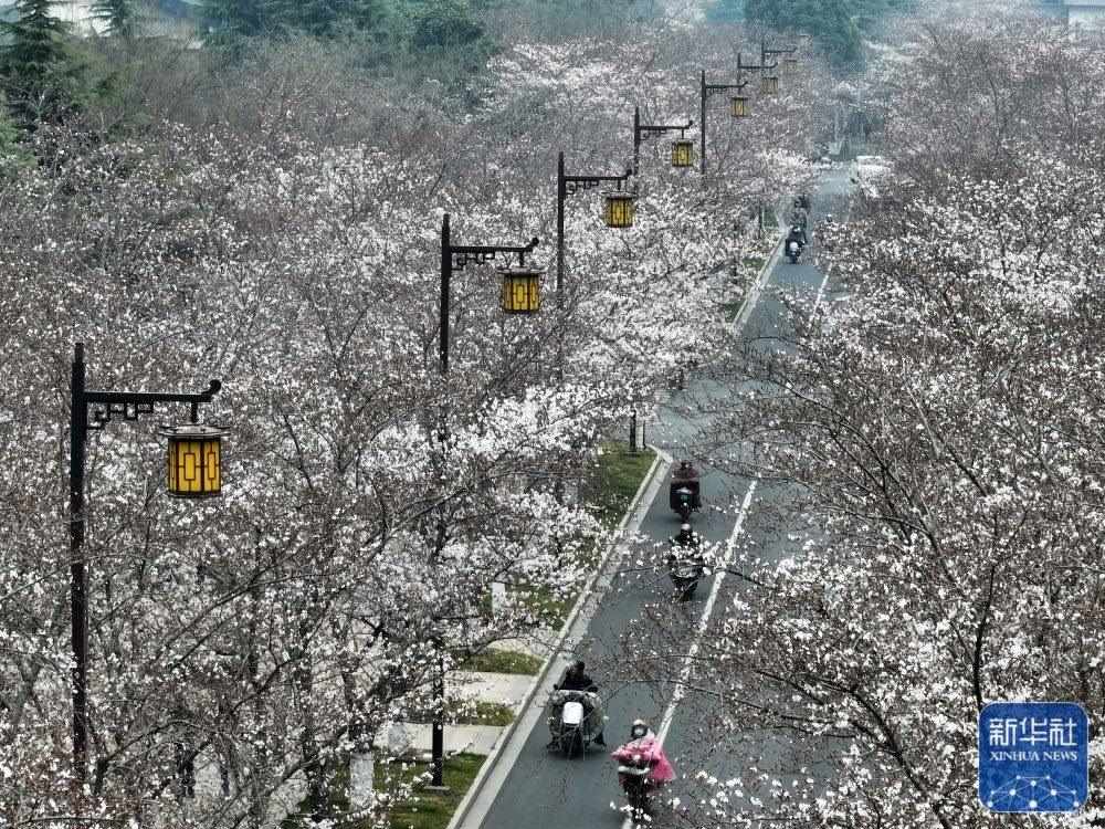 3月23日拍攝的江蘇省揚(yáng)州市鑒真路的“櫻花大道”景色(無人機(jī)照片)。新華社發(fā)(孟德龍攝)