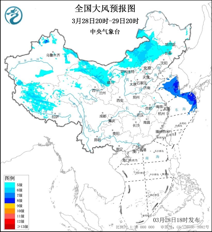 預計,3月28日20時至29日20時,內(nèi)蒙古大部、吉林西部、遼寧南部、甘肅東部、寧夏北部等地有5~6級、陣風7~9級風;黃海中部和南部海域、東海東北部海域?qū)⒂?~8級、陣風9級風,其中東海東北部的部分海域風力可達9級、陣風10級。