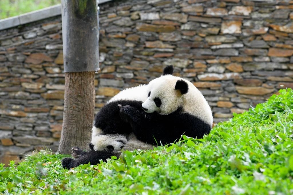 2022年4月24日,在中國(guó)大熊貓保護(hù)研究中心臥龍神樹(shù)坪基地內(nèi),一只大熊貓和大熊貓幼崽在玩耍。新華社記者 胥冰潔 攝