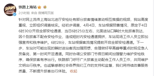 央視網(wǎng)消息:據(jù)@鐵路上海站 消息,針對(duì)網(wǎng)上流傳上海站北進(jìn)廳安檢處有部分旅客情緒激動(dòng)相互推搡的視頻,車(chē)站高度重視,立即組織調(diào)查核實(shí)。經(jīng)初步調(diào)查,4月4日,車(chē)站根據(jù)預(yù)售情況,原定于4日6時(shí)30分開(kāi)啟全部安檢通道,當(dāng)日6時(shí)25分左右,北面進(jìn)站口瞬時(shí)大批旅客到達(dá),因個(gè)別旅客不配合安檢作業(yè),造成短時(shí)內(nèi)安檢通道擁擠,車(chē)站現(xiàn)場(chǎng)工作人員立即加強(qiáng)宣傳和秩序維護(hù)。6時(shí)28分,車(chē)站根據(jù)客流情況提前開(kāi)啟全部安檢通道。下一步,車(chē)站對(duì)可能出現(xiàn)的瞬時(shí)進(jìn)站客流加強(qiáng)預(yù)想,合理做好早高峰等重點(diǎn)時(shí)段應(yīng)急人員備崗,第一時(shí)間開(kāi)足通道。同時(shí)協(xié)調(diào)公安部門(mén)節(jié)假日期間加強(qiáng)警力維護(hù)安檢秩序,確保旅客有序出行。鐵路部門(mén)呼吁廣大旅客主動(dòng)配合工作人員工作,共同維護(hù)文明出行秩序,也誠(chéng)摯感謝社會(huì)各界對(duì)其工作的支持和監(jiān)督,將持續(xù)改善服務(wù)質(zhì)量,不斷提升旅客出行體驗(yàn)。