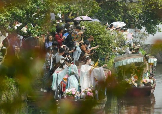 3月24日,“花神”乘坐花船在西溪濕地巡游。當(dāng)日,杭州西溪濕地一年一度的花朝節(jié)開(kāi)啟,十二花神花船巡游、古戲臺(tái)花神迎春等儀式向游客展示花朝節(jié)的傳統(tǒng)習(xí)俗,展現(xiàn)江南春日浪漫。新華社記者 翁忻旸 攝
