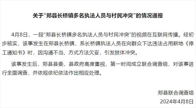 ·河南郟縣通報“多名執(zhí)法人員與村民發(fā)生沖突”:成立聯(lián)合調查組。