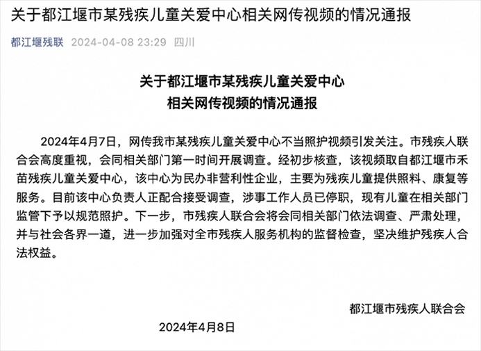 央視網消息:都江堰殘聯(lián)4月8日通報,4月7日,網傳都江堰市某殘疾兒童關愛中心不當照護視頻引發(fā)關注。市殘疾人聯(lián)合會高度重視,會同相關部門第一時間開展調查。經初步核查,該視頻取自都江堰市禾苗殘疾兒童關愛中心,該中心為民辦非營利性企業(yè),主要為殘疾兒童提供照料、康復等服務。目前該中心負責人正配合接受調查,涉事工作人員已停職,現(xiàn)有兒童在相關部門監(jiān)管下予以規(guī)范照護。下一步,市殘疾人聯(lián)合會將會同相關部門依法調查、嚴肅處理,并與社會各界一道,進一步加強對全市殘疾人服務機構的監(jiān)督檢查,堅決維護殘疾人合法權益。?