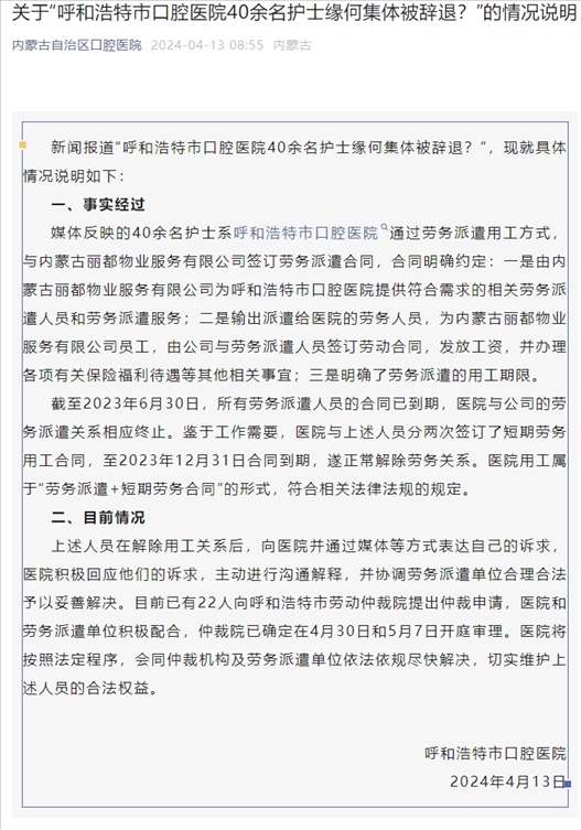 新聞報(bào)道“呼和浩特市口腔醫(yī)院40余名護(hù)士緣何集體被辭退?”,現(xiàn)就具體情況說(shuō)明如下: