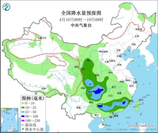全國(guó)降水量預(yù)報(bào)圖(4月18日08時(shí)-19日08時(shí))