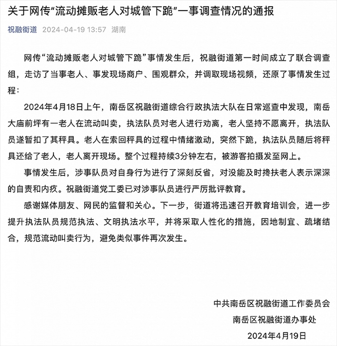央視網(wǎng)消息:4月19日,衡陽南岳區(qū)祝融街道辦事處發(fā)布關(guān)于網(wǎng)傳“流動攤販老人對城管下跪”一事調(diào)查情況的通報。