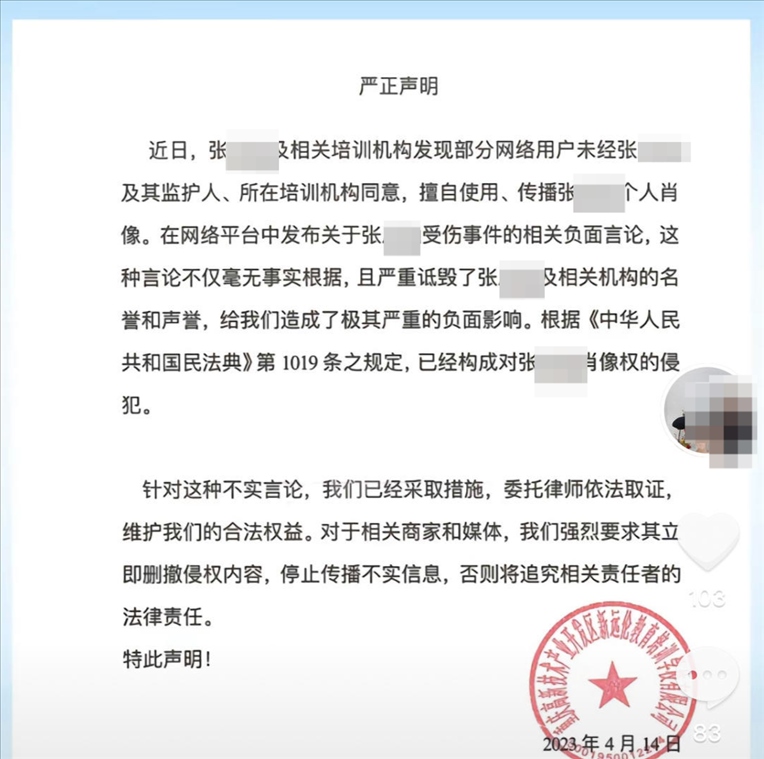紅星新聞注意到,遠(yuǎn)倫舞蹈帳號2023年2023年4月曾發(fā)布一則聲明。落款為重慶高新技術(shù)產(chǎn)業(yè)開發(fā)區(qū)新遠(yuǎn)倫教育培訓(xùn)學(xué)校有限公司(下稱遠(yuǎn)倫培訓(xùn)學(xué)校)。聲明稱,近日,張某涵及相關(guān)培訓(xùn)機(jī)構(gòu)發(fā)現(xiàn)部分網(wǎng)絡(luò)用戶未經(jīng)張某涵及其監(jiān)護(hù)人、所在培訓(xùn)機(jī)構(gòu)同意,擅自使用、傳播張某涵個人肖像。在網(wǎng)絡(luò)平臺中發(fā)布關(guān)于受傷事件的相關(guān)負(fù)面言論,這種言論不僅毫無事實根據(jù),且嚴(yán)重詆毀了張某涵及相關(guān)機(jī)構(gòu)的名譽(yù)和聲譽(yù),給公司造成了極其嚴(yán)重的負(fù)面影響,已經(jīng)構(gòu)成對張某涵肖像權(quán)的侵犯。