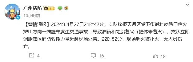 中新網(wǎng)4月28日電 據(jù)廣州消防微博消息,2024年4月27日21時42分,支隊接報天河區(qū)棠下街道科韻路口往火爐山方向一油罐車發(fā)生交通事故,導致油箱和輪胎著火(罐體未著火)。支隊立即調(diào)派轄區(qū)消防救援力量趕赴現(xiàn)場處置。22時52分,現(xiàn)場明火被撲滅,無人員傷亡。