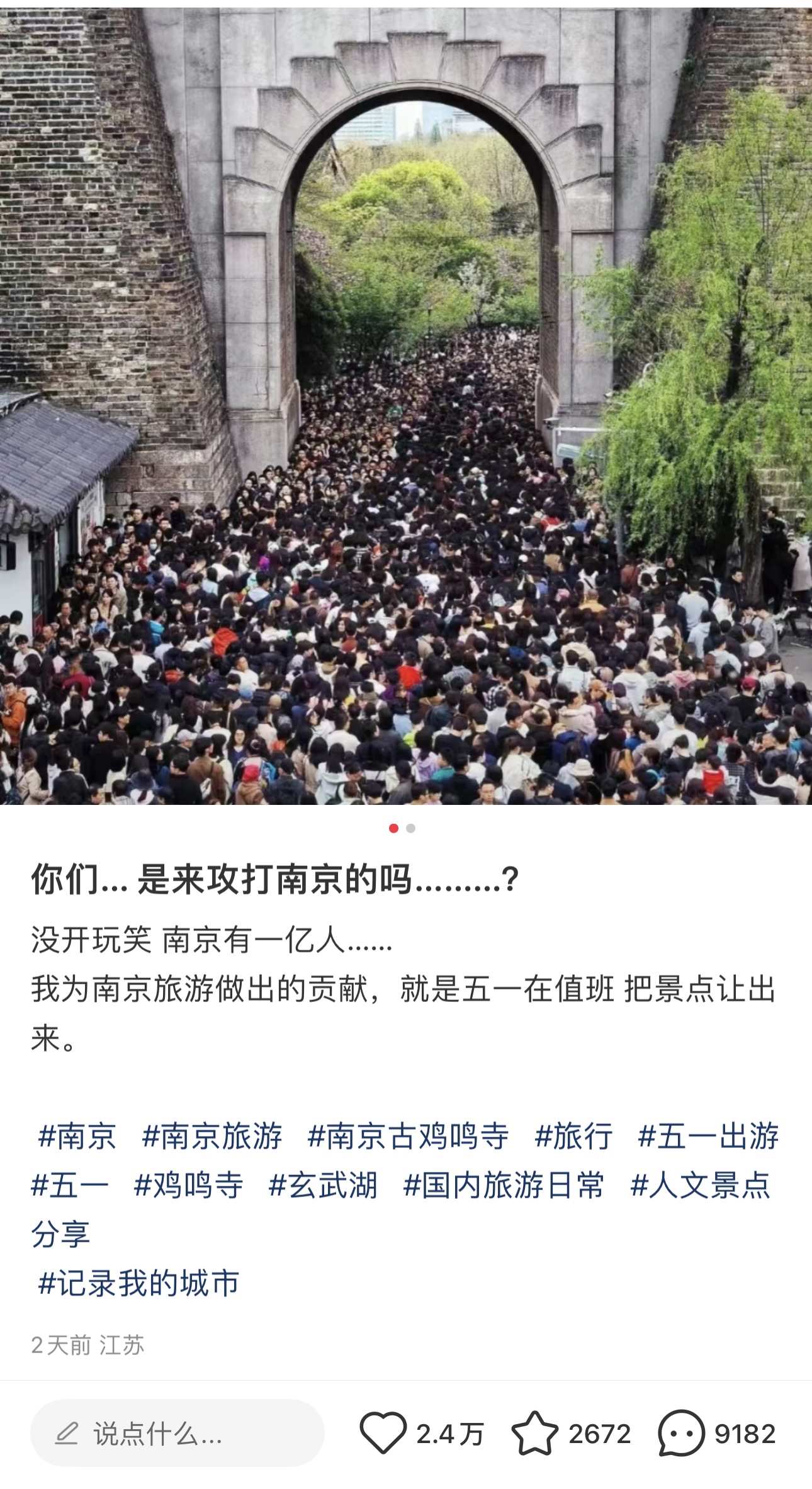 某定位顯示南京的網(wǎng)友表示:“我為南京旅游作出的貢獻,就是五一在值班,把景點讓出來。”
