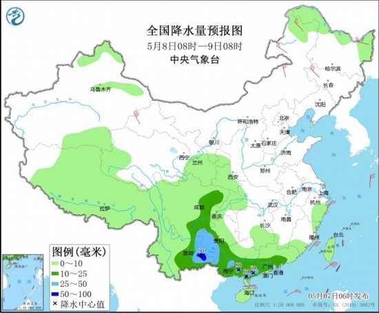 5月8日08時至9日08時,四川盆地東部、云南中東部、貴州中西部、廣西中部和南部、廣東西部和南部等地部分地區(qū)有中到大雨,其中,云南東部、廣東西南部等地部分地區(qū)有暴雨(50~90毫米)。內蒙古中東部、黑龍江北部、吉林西部、遼寧西部等地部分地區(qū)有4~6級風,陣風7-9級,甘肅河西部分地區(qū)有6~7級風。