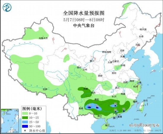 5月7日08時至8日08時,湖南南部、四川盆地東南部、重慶、貴州南部、廣西、廣東等地部分地區(qū)有中到大雨,其中,貴州南部、廣西西北部、廣東西北部和東南部等地部分地區(qū)有暴雨(50~80毫米)。內蒙古中部、黑龍江東北部、遼寧東部、甘肅河西、浙江北部等地部分地區(qū)有4~6級風,新疆東部部分地區(qū)有6~7級風。