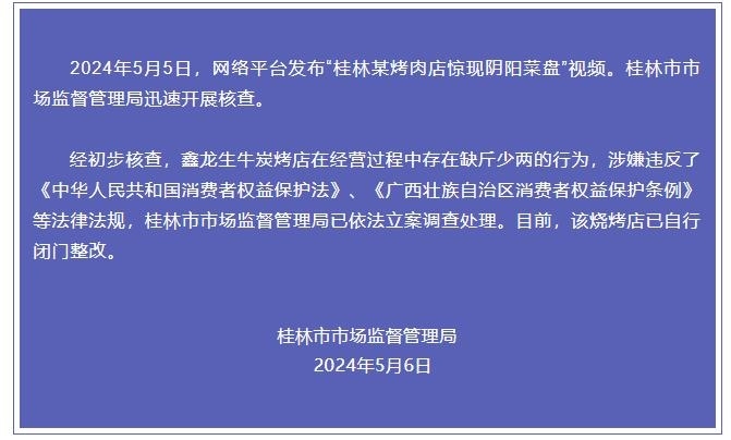 經(jīng)初步核查,鑫龍生牛炭烤店在經(jīng)營(yíng)過程中存在缺斤少兩的行為,涉嫌違反了《中華人民共和國(guó)消費(fèi)者權(quán)益保護(hù)法》、《廣西壯族自治區(qū)消費(fèi)者權(quán)益保護(hù)條例》等法律法規(guī),桂林市市場(chǎng)監(jiān)督管理局已依法立案調(diào)查處理。目前,該燒烤店已自行閉門整改。