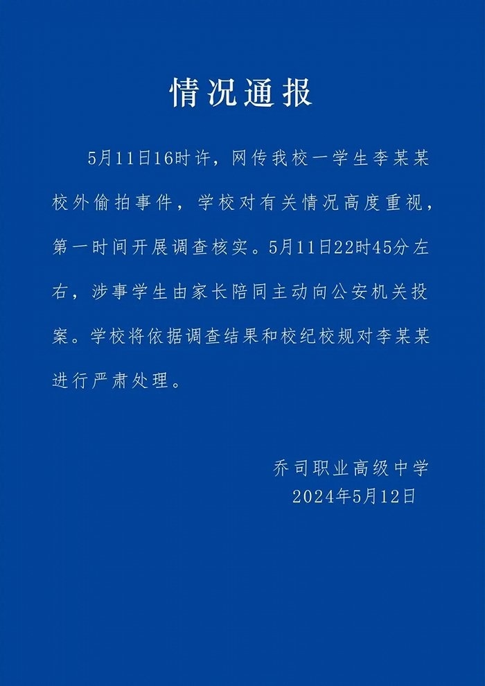 央視網(wǎng)消息:杭州市喬司職業(yè)高級中學(xué)5月12日發(fā)布情況通報,5月11日16時許,網(wǎng)傳我校一學(xué)生李某某校外偷拍事件,學(xué)校對有關(guān)情況高度重視,第一時問開展調(diào)查核實。5月11日22時45分左右,涉事學(xué)生由家長陪同主動向公安機關(guān)投案。學(xué)校將依據(jù)調(diào)查結(jié)果和校紀(jì)校規(guī)對李某某進行嚴(yán)肅處理。