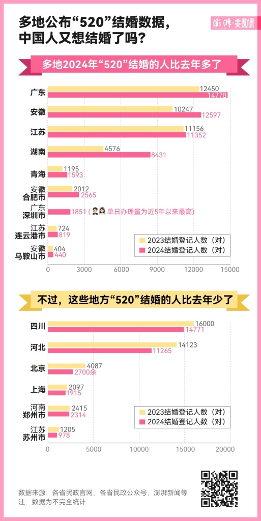 2023 年多地“520”領證人數(shù)下跌,引起熱議。2024 年的“520”剛剛過去,多地披露了當日結(jié)婚登記數(shù)。廣東、安徽、江蘇等省當日領證人數(shù)較去年有回升。澎湃新聞從深圳市民政局獲悉,截至 5 月 20 日 18 時 30 分,“520”全天共辦理結(jié)婚登記 1851 對,單日辦理量為近 5 年以來最高。中國人又重燃對婚姻的渴望了嗎?