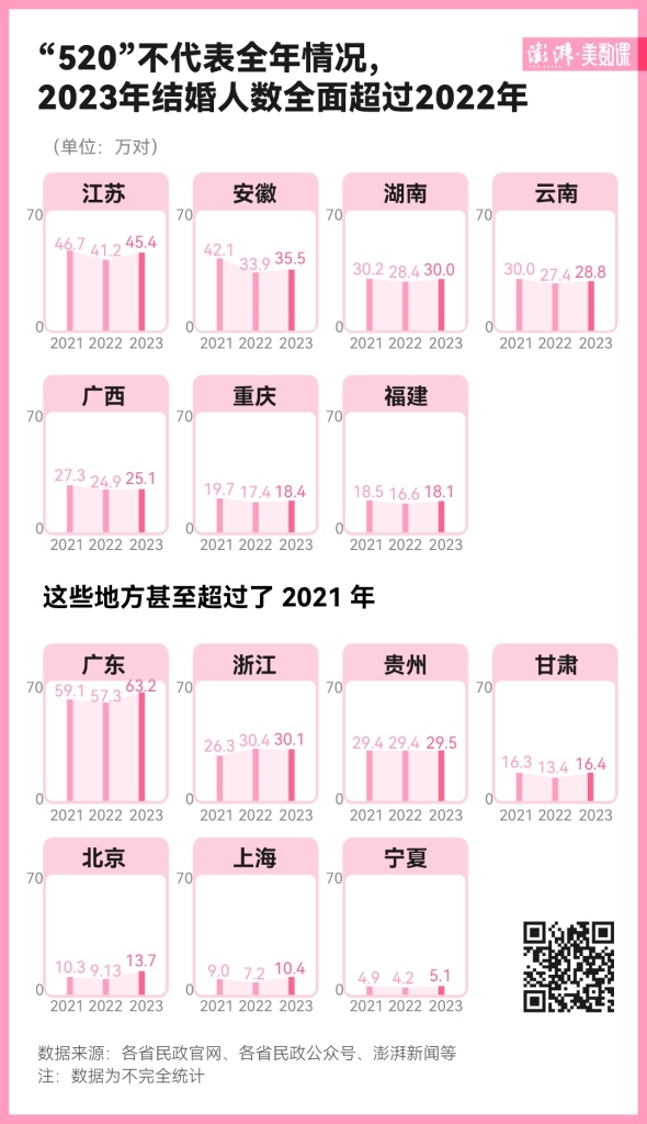 2023 年多地的“520”領證人數(shù)下跌,媒體報道稱“年輕人不太愿為愛結(jié)婚了”,但實際上,全年情況卻沒這么慘淡。