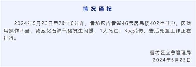 央視網(wǎng)消息:哈爾濱市香坊區(qū)應急管理局發(fā)布情況通報,2024年5月23日早7時10分許,香坊區(qū)古香街46號居民樓402室住戶,因使用操作不當,致液化石油氣罐發(fā)生閃爆,1人死亡,3人受傷。善后處置工作正在進行。