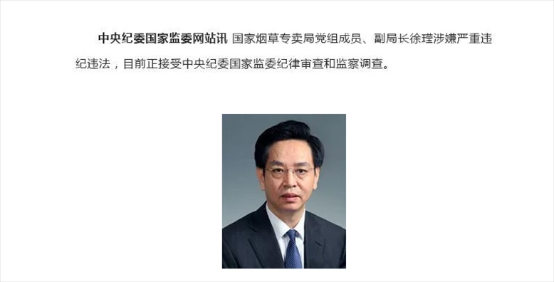 ·國家煙草專賣局黨組成員、副局長接受中央紀委國家監(jiān)委紀律審查和監(jiān)察調(diào)查。