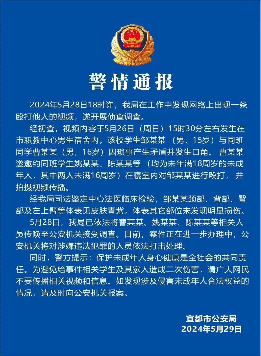 經(jīng)初查,視頻內(nèi)容于5月26日(周日)15時(shí)30分左右發(fā)生在市職教中心男生宿舍內(nèi)。該校學(xué)生鄒某某(男,15歲)與同班同學(xué)曹某某(男,16歲)因瑣事產(chǎn)生矛盾并發(fā)生口角。曹某某遂邀約同班學(xué)生姚某某、陳某某等(均為未年滿18周歲的未成年人,其中兩人未滿16周歲)在寢室內(nèi)對(duì)鄒某某進(jìn)行毆打,并拍攝視頻傳播。