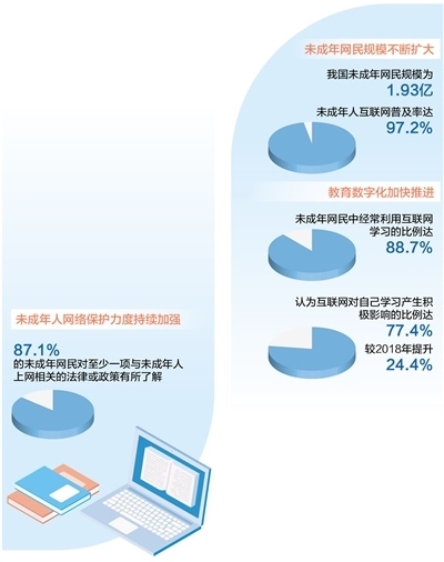 我國教育數字化加快推進,越來越多的未成年人積極擁抱數字化、信息化、智能化的學習方式,更加廣泛、自主地利用互聯網開展學習活動。報告顯示,未成年網民中經常利用互聯網進行學習的比例達88.7%;認為互聯網對自己學習產生積極影響的比例,從2018年的53%提升到2022年的77.4%。