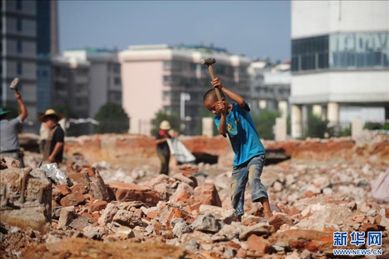 在柳州市北雀路一處工地,熊三耶和伙伴們在打鐵(2013年8月29日攝)。新華社記者 黃孝邦 攝