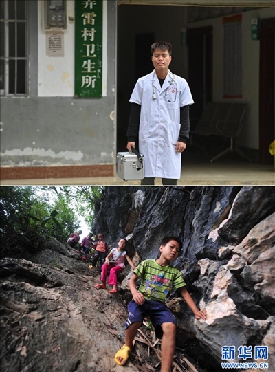 下圖為2012年9月5日,10歲的蒙富松(右一)爬懸崖去學(xué)校讀書。新華社記者 黃孝邦 攝