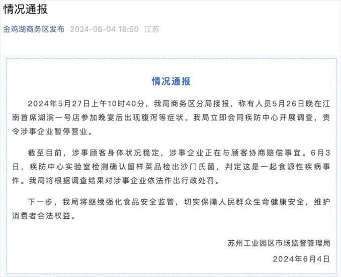 央視網(wǎng)消息:據(jù)蘇州工業(yè)園區(qū)市場監(jiān)督管理局通報,5月27日上午10時40分,商務(wù)區(qū)分局接報,稱有人員5月26日晚在江南首席湖濱一號店參加晚宴后出現(xiàn)腹瀉等癥狀。該局立即會同疾防中心開展調(diào)查,責(zé)令涉事企業(yè)暫停營業(yè)。