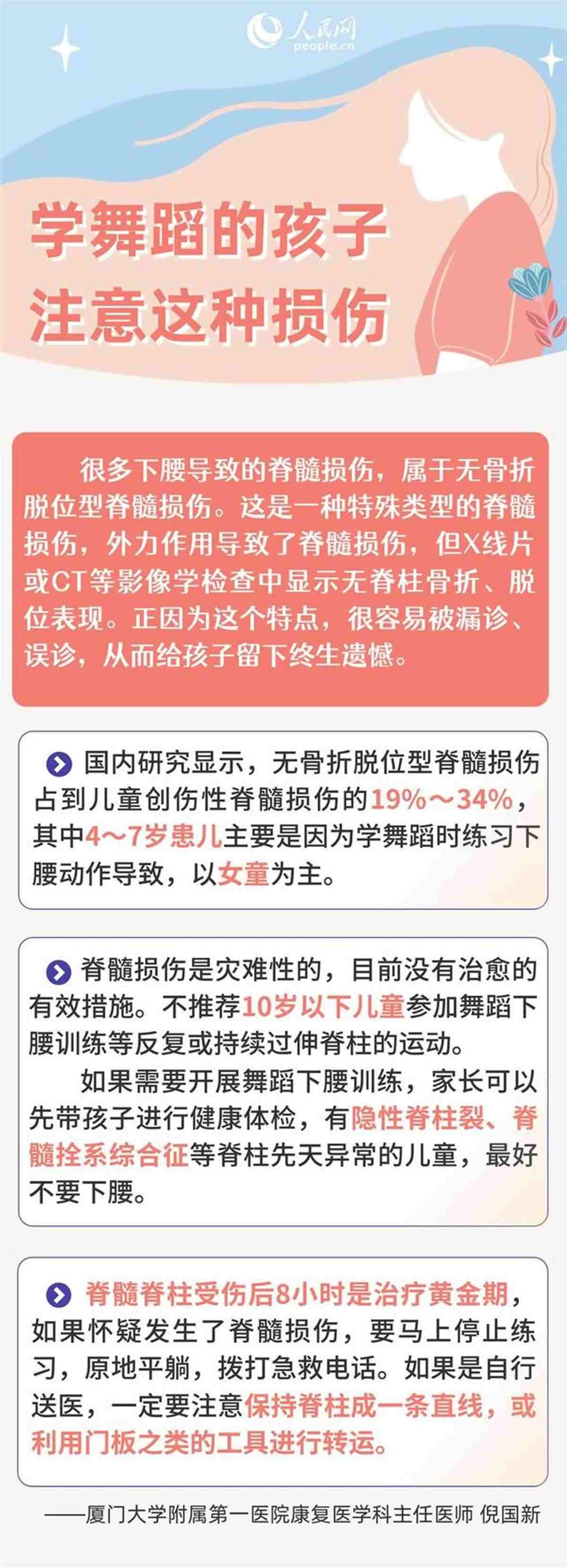 廈門大學附屬第一醫(yī)院康復醫(yī)學科主任醫(yī)師倪國新對記者表示,兒童練習舞蹈雖然好處多多,但需要注意的是,下腰、壓腿等動作存在一定的危險性,嚴重的甚至會導致截癱,在練習過程中要謹防脊髓損傷。