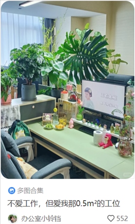 “按個人喜好裝修的工位可以讓年輕人在這一方小天地里可以獲得短暫的歸屬感與安全感,將目之所及之處都變成自己想要的樣子,令他們在客觀條件有限的情況下盡可能讓自己感到舒適,也更容易從工作中感到幸福?!庇诠馊鸱治稣f。