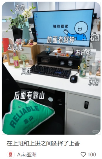 有網(wǎng)友分享工位的風(fēng)水大有講究:擺滿綠植象征欣欣向榮,整體布置左高右低;后背有靠,面不對門;左靠窗,水杯放左邊,寓意風(fēng)生水起;雜物放桌面左邊,右邊越簡約越好。