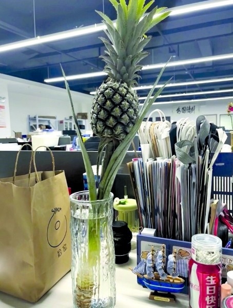 00后楊三日從事新媒體運(yùn)營工作,她在工位上養(yǎng)了一個菠蘿,“養(yǎng)菠蘿是一件很酷的事情,不僅能觀賞,還能吃,很配我特立獨(dú)行的氣質(zhì)。”她說自從養(yǎng)了菠蘿之后,每天上班時心情就變得非常好。“我的工位就像熱帶雨林一樣,提前進(jìn)入了春天?!?/p>
