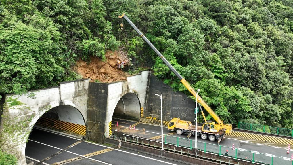 6月12日,南平高速公路養(yǎng)護(hù)部門工作人員在清理隧道頂部松動的碎石。(受訪者供圖)