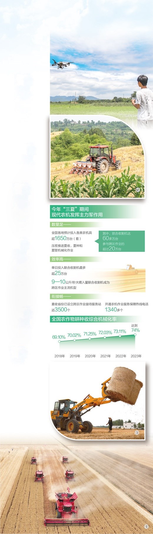 圖①:湖南省藍(lán)山縣塔峰鎮(zhèn)荷葉塘村,農(nóng)技人員操作植保無人機在田間進(jìn)行施肥作業(yè)。彭 華攝(人民視覺) 圖②:四川省蓬溪縣群利鎮(zhèn)五龍村,農(nóng)機手駕駛播種機開展大豆玉米復(fù)合播種。吳奉家攝(人民視覺) 圖③:山東省棗莊市嶧城區(qū)古邵鎮(zhèn)新村,農(nóng)機手實施小麥秸稈裝車運輸作業(yè)。孫 慧攝(人民視覺) 圖④:河南省舞陽縣田間,聯(lián)合收割機高效開展麥?zhǔn)兆鳂I(yè)。姚 彬攝(人民視覺) 數(shù)據(jù)來源:農(nóng)業(yè)農(nóng)村部