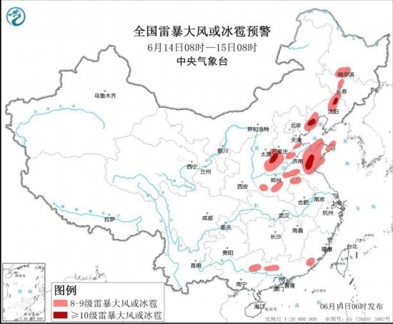 預(yù)計(jì)6月14日08時(shí)至15日08時(shí),黑龍江南部、吉林中西部、遼寧西部和北部、山西東南部、河北南部和東北部、山東中東部和南部、河南中北部和東部、安徽北部、江蘇北部等地的部分地區(qū)將有8級以上雷暴大風(fēng)或冰雹天氣,其中,遼寧北部和西部、山西東南部、河北南部和東北部、山東中南部等地的局地將有10級以上雷暴大風(fēng),最大風(fēng)力可達(dá)11級以上;渤海部分海域、萊州灣、山東半島附近海域?qū)⒂?~10級的雷暴大風(fēng)。黑龍江南部和中東部、吉林南部和西北部、遼寧中東部和西南部、河北東北部、山東中東部和南部等地的部分地區(qū)將有小時(shí)雨量大于20毫米的短時(shí)強(qiáng)降水天氣,其中,黑龍江中部、山東中南部等地的局地小時(shí)雨量大于50毫米,最大可達(dá)80毫米以上。預(yù)計(jì),強(qiáng)對流的主要影響時(shí)段為今天午后至夜間。中央氣象臺6月14日06時(shí)發(fā)布強(qiáng)對流天氣藍(lán)色預(yù)警(見圖2)。