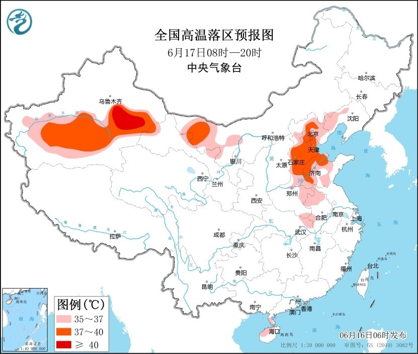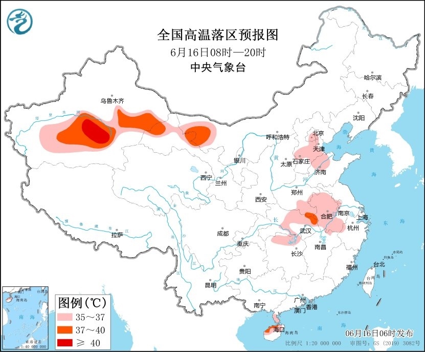 16日,華北、黃淮等地高溫強度將有所減弱、范圍將有所減小,但預計6月16日白天,內蒙古西北部、新疆南疆盆地和東部、甘肅河西、河北中部、北京、山東西北部、河南東部和南部、安徽、湖北東北部、海南島北部等地仍有35~36℃高溫天氣,其中,內蒙古西北部、新疆南疆盆地和東部、河南東南部等地部分地區(qū)最高氣溫37~39℃,新疆南疆盆地局地可達40℃以上。
