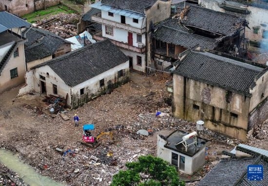 6月28日,工作人員在黃山市歙縣溪頭鎮(zhèn)進行災后清理工作(無人機照片)。