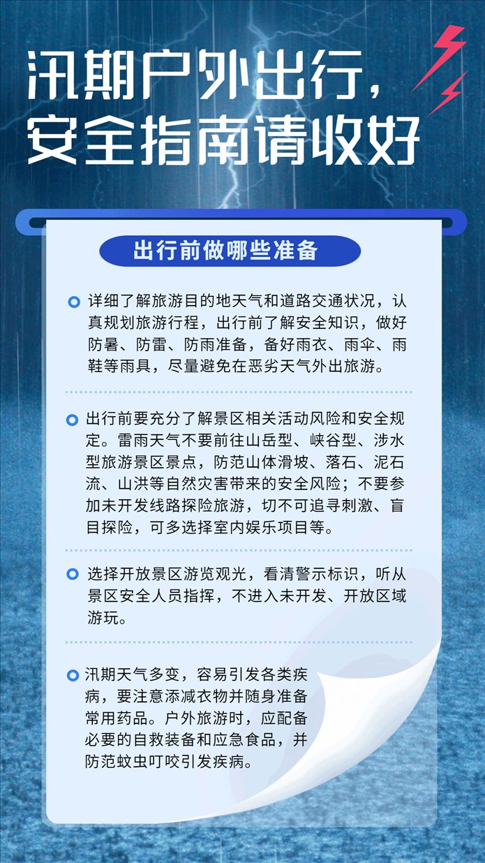 汛期戶外出行,這份安全指南請收好 當(dāng)前正值暑假旅游旺季,也是汛期災(zāi)害事故易發(fā)多發(fā)時期......