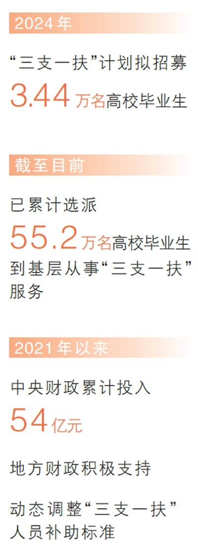 在奮斗中書寫青春華章,在奉獻(xiàn)中成就事業(yè)。2006年“三支一扶”計劃開展以來,50多萬名高校畢業(yè)生扎根鄉(xiāng)村,開展支教、支農(nóng)、支醫(yī)等服務(wù)。2024年,“三支一扶”計劃擬招募3.44萬名高校畢業(yè)生到基層開展相關(guān)服務(wù)。