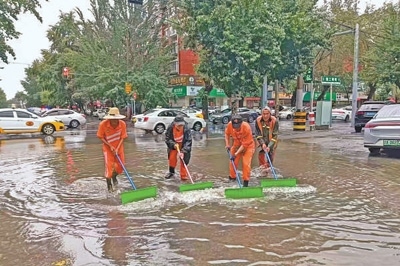 7月26日,遼寧省氣象局發(fā)布暴雨橙色預(yù)警。受強(qiáng)降水影響,遼寧有11個(gè)市啟動(dòng)了防汛應(yīng)急響應(yīng)。圖為26日環(huán)衛(wèi)工人在沈陽市街頭清除積水。新華社發(fā)