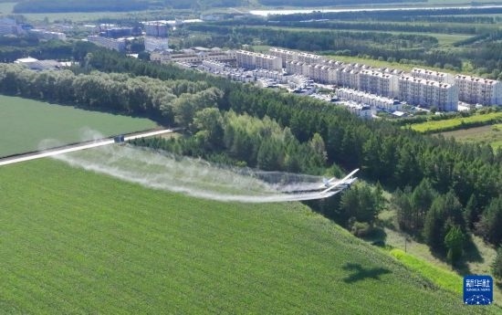 8月2日,農(nóng)用飛機在北大荒集團黑龍江尖山農(nóng)場有限公司農(nóng)業(yè)科技服務中心玉米田噴施葉面肥(無人機照片)。