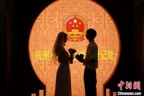 8月10日正值中國(guó)傳統(tǒng)節(jié)日七夕節(jié),超200對(duì)新人來(lái)到上城區(qū)婚姻登記服務(wù)中心領(lǐng)證。紅色的背景墻、金色的中式格柵、宋韻特色的剪影板,這些極具中式浪漫的設(shè)計(jì)見(jiàn)證了一對(duì)對(duì)新人的美好結(jié)合,也成為了熱門(mén)打卡點(diǎn)。