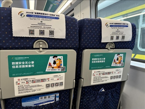 據(jù)介紹,專列的8個(gè)主題車(chē)廂分別以“中國(guó)網(wǎng)絡(luò)法治三十年”“網(wǎng)絡(luò)安全”“數(shù)據(jù)安全”“未成年人網(wǎng)絡(luò)保護(hù)”“數(shù)據(jù)出境之旅”“反網(wǎng)暴凈網(wǎng)行動(dòng)”“個(gè)人信息守護(hù)”以及“網(wǎng)絡(luò)空間命運(yùn)共同體”命名,通過(guò)鏡框海報(bào)、玻璃貼、小桌板貼、行李架彩貼、頭枕片、車(chē)內(nèi)LED信息屏等形式多樣的載體,全面展示網(wǎng)絡(luò)法治30年成就、網(wǎng)絡(luò)空間命運(yùn)共同體主張。讓乘客們?cè)谙硎苁孢m旅途的同時(shí),也能輕松學(xué)習(xí)到實(shí)用的法律信息。