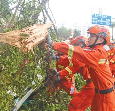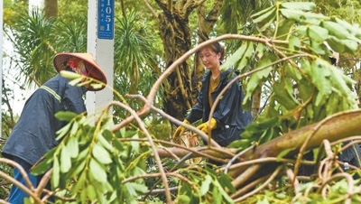 9月7日,海南省??谑泄ぷ魅藛T在??谑袨I海大道上清理被風(fēng)吹倒的樹(shù)木。新華社記者 楊冠宇攝