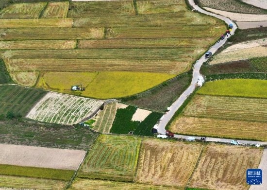 10月23日,收割機(jī)在廣西南寧市邕寧區(qū)蒲廟鎮(zhèn)收割晚稻(無(wú)人機(jī)照片)。