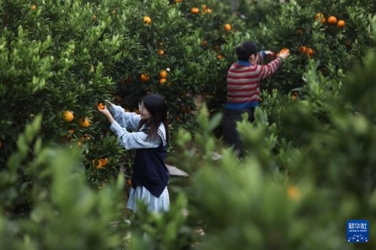 11月10日,在三都鎮(zhèn)柑橘種植基地,游客采摘柑橘。三都鎮(zhèn)柑橘種植面積達2.8萬畝,總產量4.2萬噸。