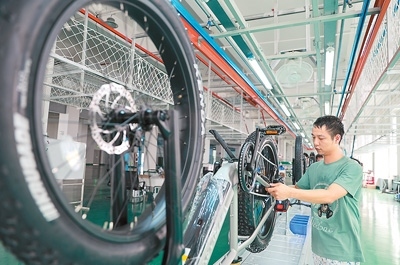 江西省九江經(jīng)濟(jì)技術(shù)開(kāi)發(fā)區(qū)九江馳暢車(chē)業(yè)有限公司生產(chǎn)車(chē)間內(nèi),工人正在組裝銷(xiāo)往歐美市場(chǎng)的新能源助力自行車(chē)。魏東升攝(人民視覺(jué))